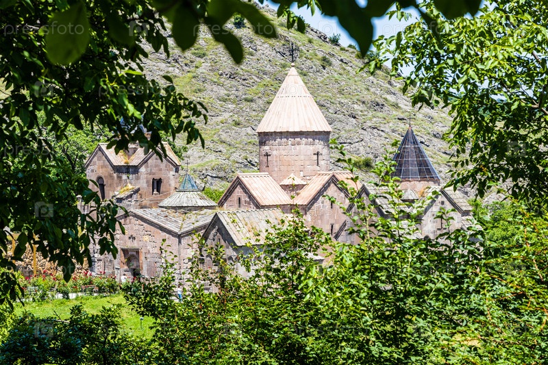 Монастырь Гошаванк в обрамлении зеленых листьев