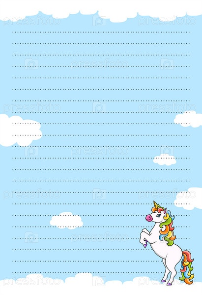 Шаблон цветного листа для заметок с единорогом. Бумажная страница для журнала, блокнота, дневника, писем, расписания, органайзера. Милый персонаж мультфильма. Линованный лист. Векторная иллюстрация