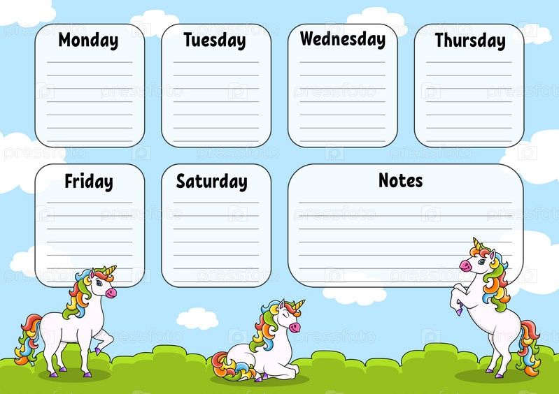 Расписание занятий в школе с волшебным единорогом. Для обучения детей. Изолировано на белом фоне. С милым персонажем мультфильма