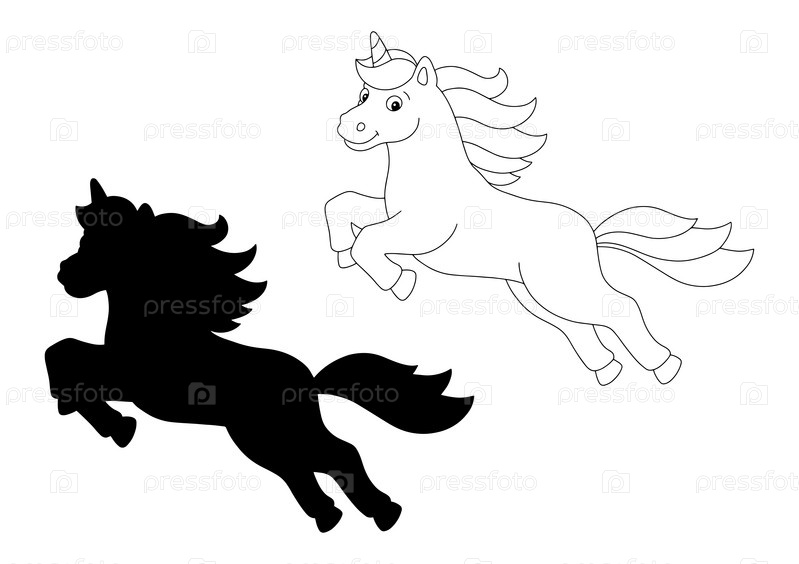 Черный силуэт единорога. Элемент дизайна. Векторная иллюстрация, изолированная на белом фоне. Шаблон для книг, наклеек, плакатов, открыток, одежды