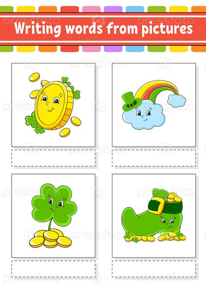 Написание слов по картинкам. Развивающий рабочий лист для обучения. Страница с заданиями для детей. Головоломка для детей. Изолированная векторная иллюстрация. Персонажи мультфильмов. День Святого Патрика