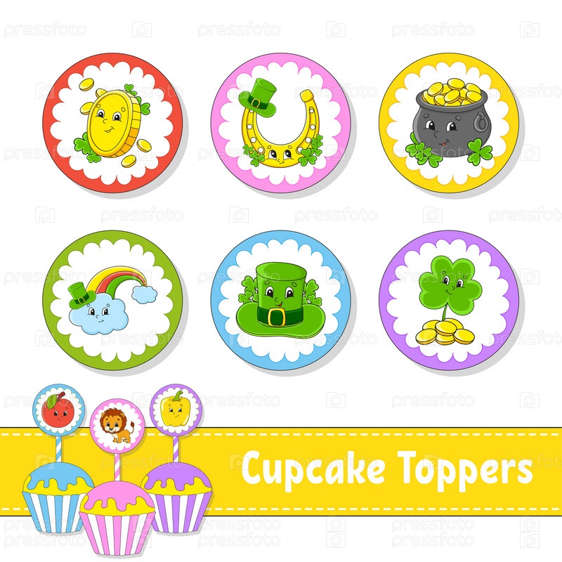 Украшение для кексов. Набор из шести круглых картинок. Персонажи мультфильмов. Милое изображение. На день рождения, празднование рождения ребенка. Изолированные на белом фоне. Векторная иллюстрация