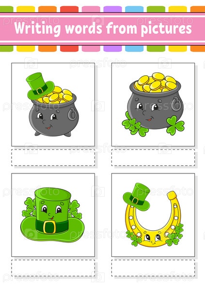 Написание слов по картинкам. Развивающий рабочий лист для обучения. Страница с заданиями для детей. Головоломка для детей. Изолированная векторная иллюстрация. Персонажи мультфильмов. День Святого Патрика