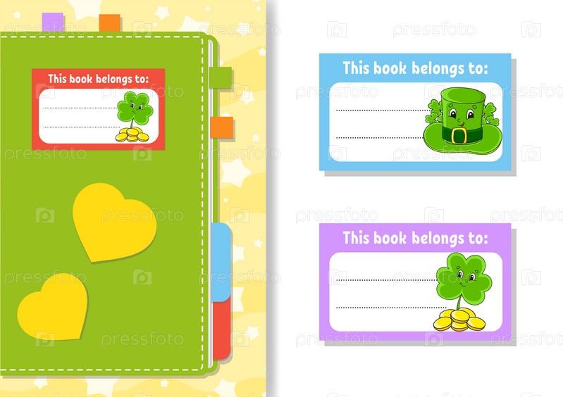 Наклейки на этикетки книг для детей. Прямоугольная форма. Персонаж мультфильма. Для дневника, блокнота, книги. Изолированные на белом фоне. Векторная иллюстрация