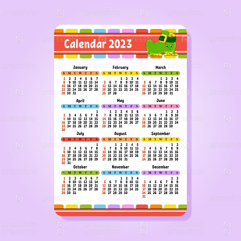 Календарь на 2023 год с милым персонажем. Веселый и яркий дизайн. Карманный размер. Мультяшный стиль. Векторная иллюстрация