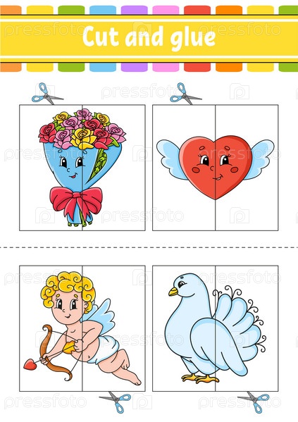 Разрезай и играй. Бумажная игра с клеем. Флэш-карточки. Образовательный рабочий лист. Страница с заданиями. Забавный персонаж. Изолированная векторная иллюстрация. Мультяшный стиль. День святого Валентина