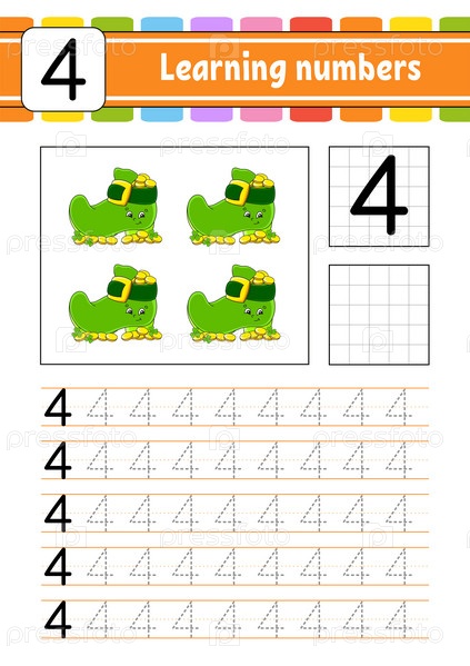 Обведи и напиши цифры. Практика письма. Изучение цифр для детей. Развивающий рабочий лист. Страница с заданиями. Векторная иллюстрация