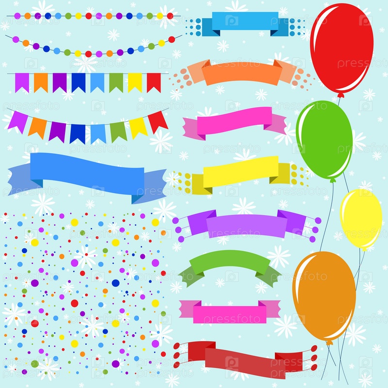 Набор плоских цветных изолированных шаров на веревках и гирлянды из флажков. Набор лент баннеров разной формы. Фон в виде конфетти