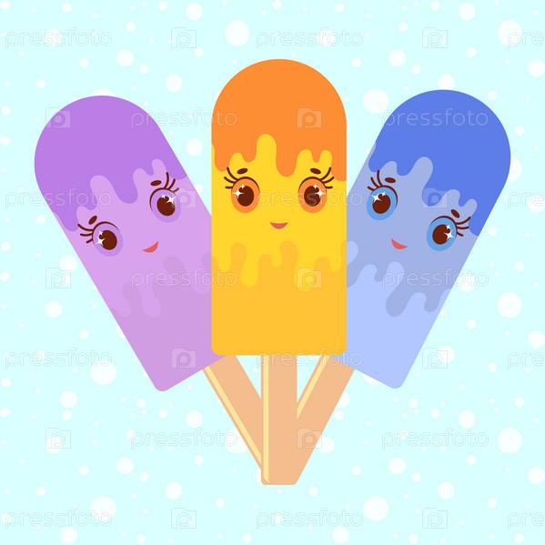 Набор плоского цветного изолированного мультяшного мороженого, политого глазурью оранжевого, синего, фиолетового цвета. На деревянных палочках. Иллюстрация на абстрактном синем фоне