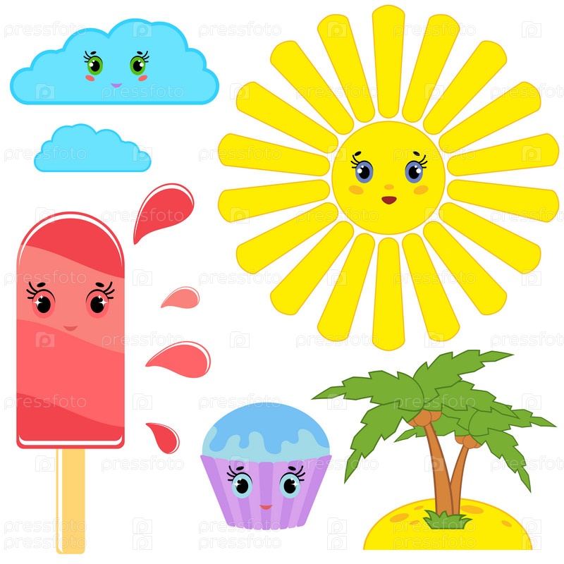 Набор различных элементов дизайна. синие облака, желтое солнце, полосатое эскимо с протечками, светло-голубой торт, зеленые пальмы на пляже. Простой плоский цветной мультяшный изолированный рисунок на белом фоне