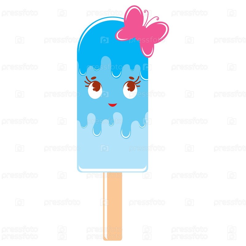 Плоское цветное изолированное полосатое мороженое, посыпанное глазурью синего цвета. На деревянной палочке. С маленькой розовой бабочкой. Простой рисунок на белом фоне