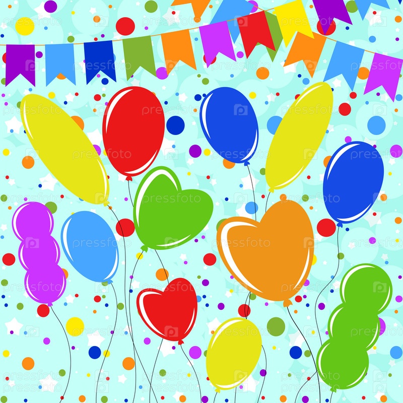 Набор плоских цветных шаров, изолированных на веревках. Простой дизайн на синем фоне с гирляндами и конфетти