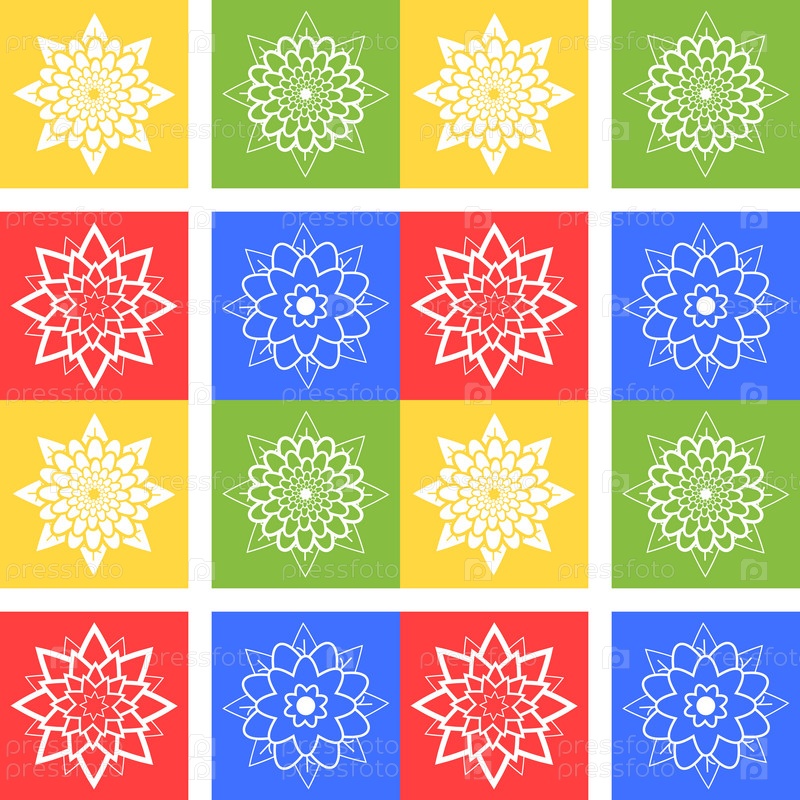Цветной бесшовный узор с белыми силуэтами абстрактных цветов на фоновых квадратах. Простая плоская векторная иллюстрация. Подходит для обоев, ткани, оберточной бумаги, обложек