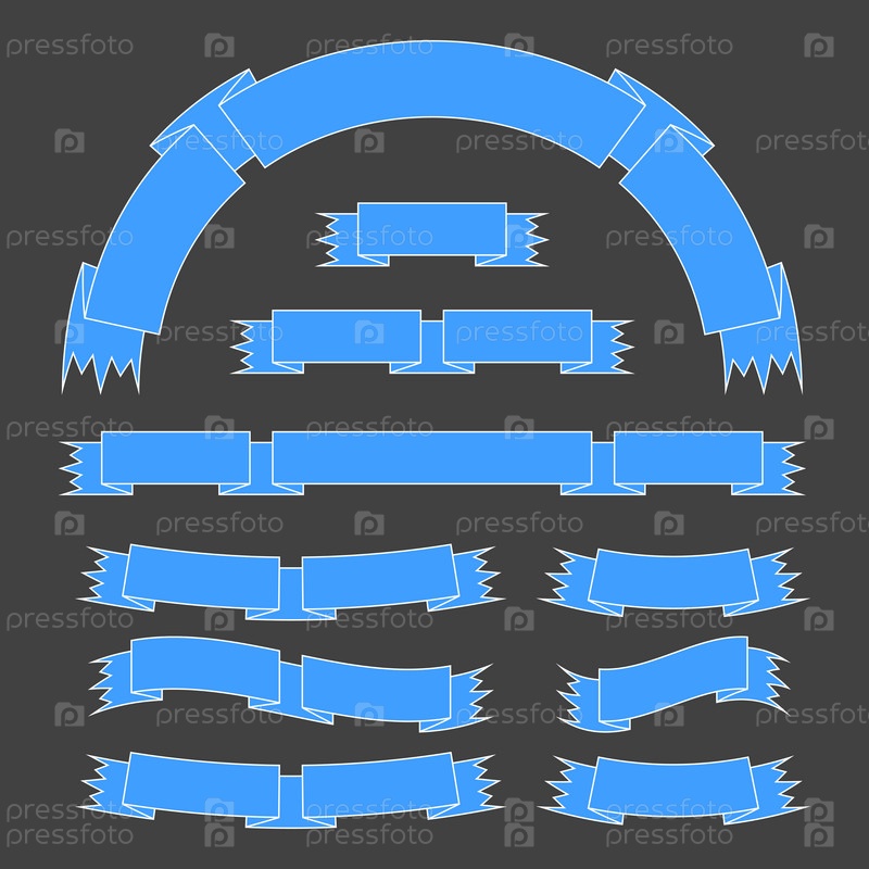 Набор плоских изолированных синих лент и баннеров на темном фоне. Простая плоская векторная иллюстрация. С местом для текста. Подходит для инфографики, дизайна, рекламы, фестивалей, этикеток