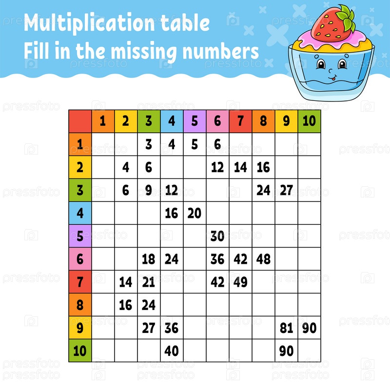 Вставьте пропущенные цифры. Изучение таблицы умножения. Практика письма. Образовательный развивающий рабочий лист. Цветная страница с заданиями. Игра для детей. Векторная иллюстрация