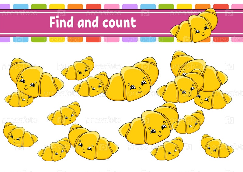 Найти и посчитать. Рабочий лист по развитию образования. Страница с заданиями. Игра-головоломка для детей. Тема дня рождения. Тренировка логического мышления. Изолированная векторная иллюстрация. Персонаж мультфильма