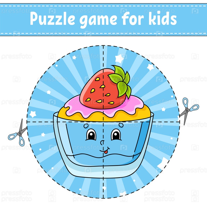 Разрезай и играй. Круглая головоломка. Логическая головоломка для детей. Страница с заданиями. Тема дня рождения. Практика вырезания для дошкольников. Персонаж мультфильма