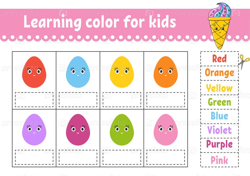 Изучение цвета для детей. Образовательный развивающий рабочий лист. Страница с заданиями с цветными картинками. Загадка для детей. Забавный персонаж. Мультяшный стиль. Векторная иллюстрация