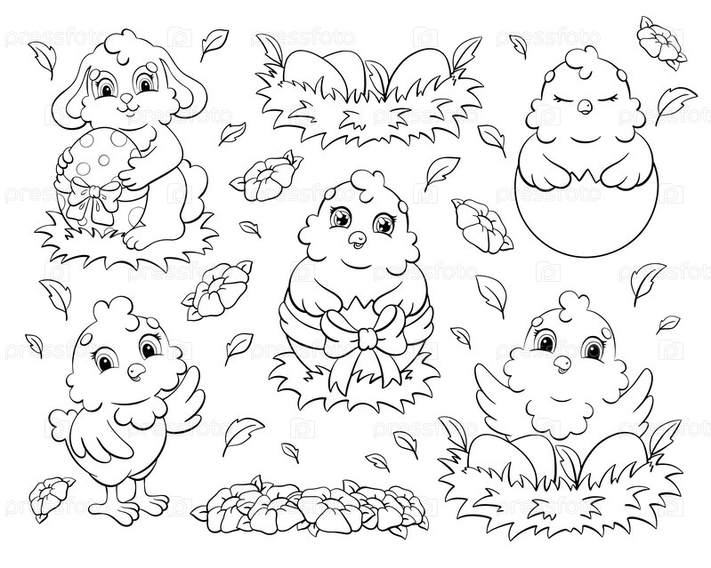Страница раскраски для детей. Набор милых цыплят и кролика. Пасхальная тема. Персонаж в мультяшном стиле. Векторная иллюстрация на белом фоне
