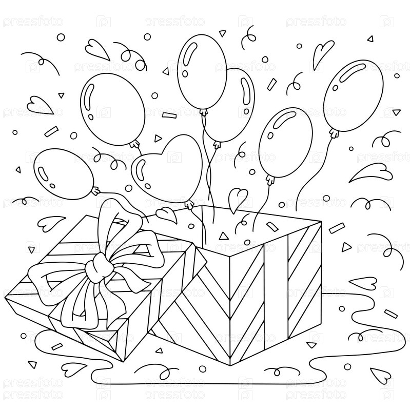 Подарочная коробка с воздушными шарами. Страница раскраски для детей. Мультяшный стиль. Векторная иллюстрация на белом фоне