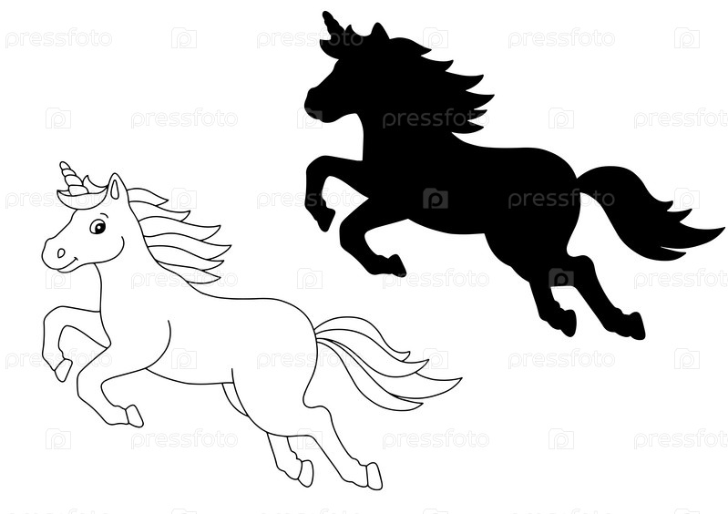 Единорог силуэт и раскраска. Элемент дизайна. Векторная иллюстрация изолирована на белом фоне. Шаблон для книг, наклеек, плакатов, карт, одежды