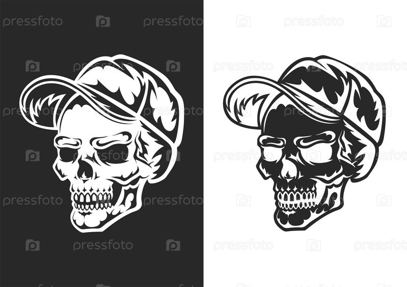 Человеческий череп в кепке. Черный силуэт. Элемент дизайна. Нарисованный от руки эскиз. Винтажный стиль. Векторная иллюстрация, изолированная на белом фоне