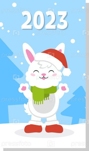 Подарочная цветная поздравительная открытка. Символ кролика в шапке Санты. Милый персонаж мультфильма. С Новым годом и Рождеством. Плоский стиль. Векторная иллюстрация