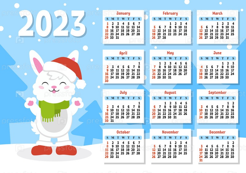 Цветной календарь на 2023 год с милым персонажем-кроликом. Неделя начинается в воскресенье. Веселый и яркий дизайн. Мультяшный стиль. Векторная иллюстрация
