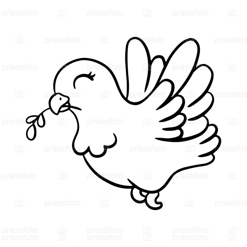 Голубь держит в клюве оливковую ветвь. Голубь — символ мира и любви. Раскраска для детей. Цифровая марка. Персонаж в мультяшном стиле. Векторная иллюстрация на белом фоне