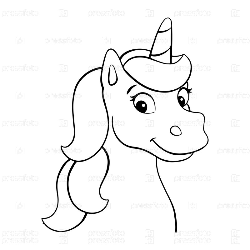 Раскраска для детей голова единорога. Цифровой штамп. Персонаж в мультяшном стиле. Векторная иллюстрация на белом фоне