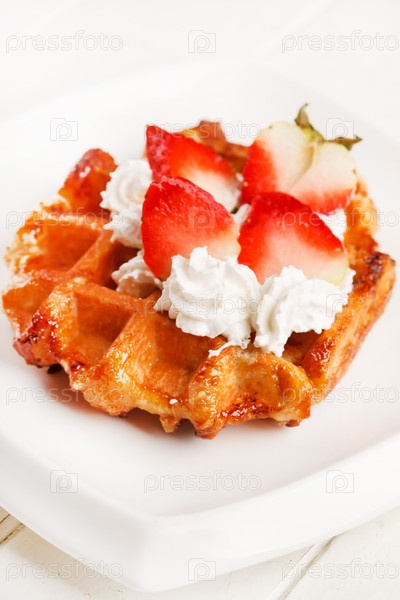 Бельгийские вафли со свежей клубникой и взбитыми сливками