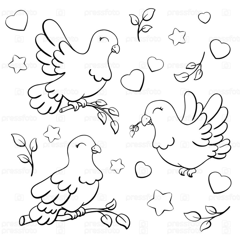 Голубь - символ мира и любви. Раскраска для детей. Цифровая марка. Персонаж в мультяшном стиле. Векторная иллюстрация на белом фоне