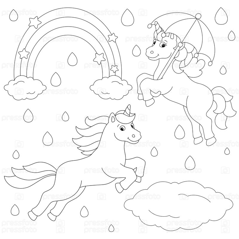Единороги гуляют под дождем. Раскраска для детей. Персонаж в мультяшном стиле. Векторная иллюстрация на белом фоне