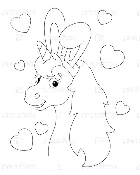 Голова волшебного единорога с ушками кролика. Сказочная лошадь. Страница раскраски для детей. Персонаж в мультяшном стиле. Векторная иллюстрация на белом фоне