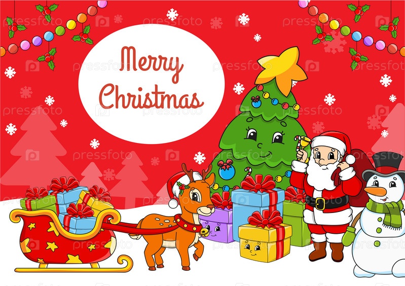 Подарочная цветная поздравительная открытка. Санта-Клаус, олень и снеговик. Милый персонаж мультфильма. С Новым годом и Рождеством. Плоский стиль. Векторная иллюстрация