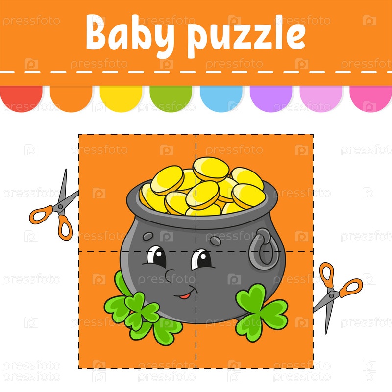 Детская головоломка. Легкий уровень. Флэш-карточки. Разрезай и играй. Рабочий лист с заданиями по цвету. Игра для детей. Персонаж мультфильма. Векторная иллюстрация