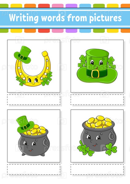 Написание слов по картинкам. Развивающий рабочий лист для обучения. Страница с заданиями для детей. Головоломка для детей. Изолированная векторная иллюстрация. Персонажи мультфильмов. День Святого Патрика