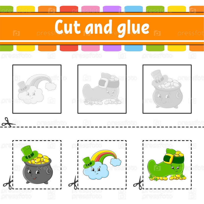 Вырежи и склей. Игра для детей. Образовательно-развивающий рабочий лист. Цветная страница с заданиями. Персонаж мультфильма. День Святого Патрика