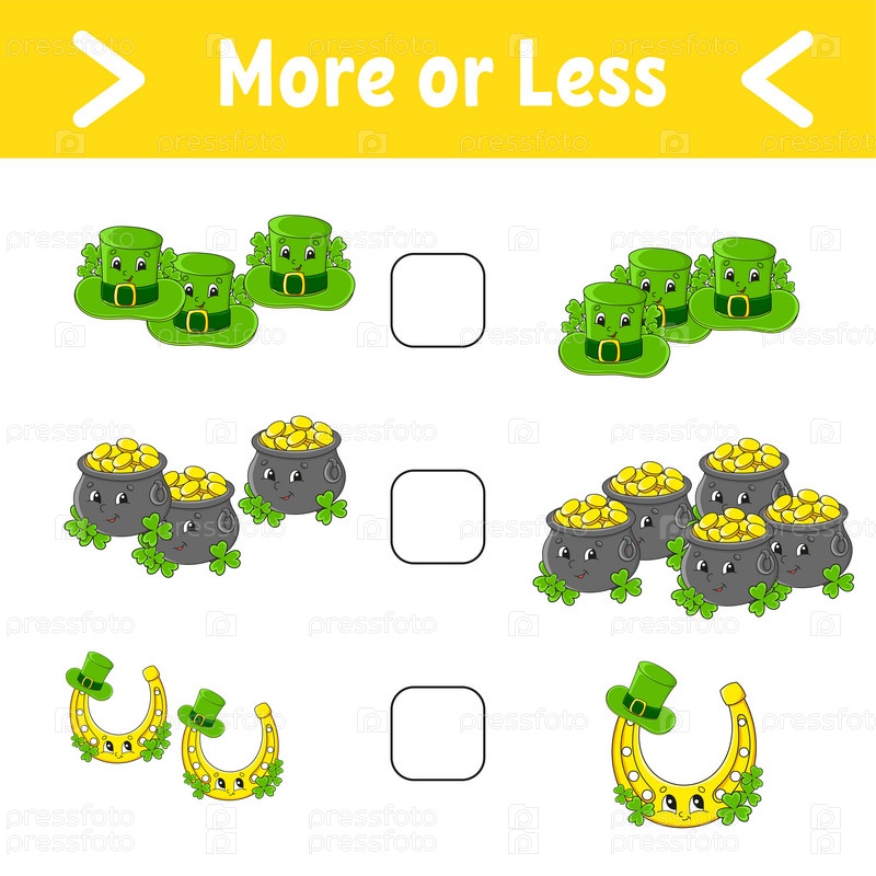 Более или менее. Образовательный рабочий лист для детей и малышей. Изолированная цветная векторная иллюстрация в милом мультяшном стиле. День Святого Патрика