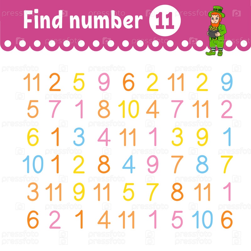 Найдите число. Образовательный развивающий рабочий лист. Страница с заданиями с картинками. Игра для детей. Цветная изолированная векторная иллюстрация. Забавный персонаж. Мультяшный стиль