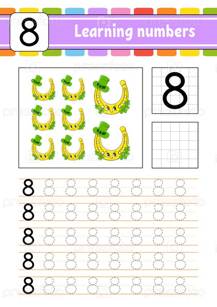 Обводка и написание цифр. Практика письма. Изучение цифр для детей. Образовательный развивающий рабочий лист. День Святого Патрика. Страница с заданиями. Изолированная векторная иллюстрация в милом мультяшном стиле
