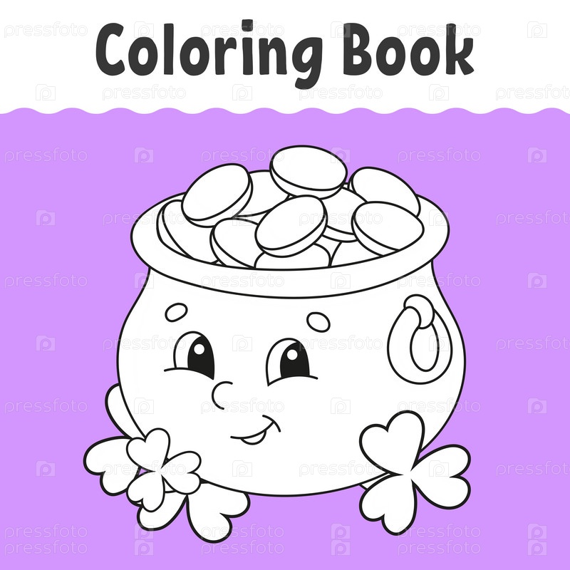 Раскраска для детей. Веселый персонаж. Милый мультяшный стиль. Фэнтезийная страница для детей. День Святого Патрика. Черный контурный силуэт на цветном фоне. Векторная иллюстрация
