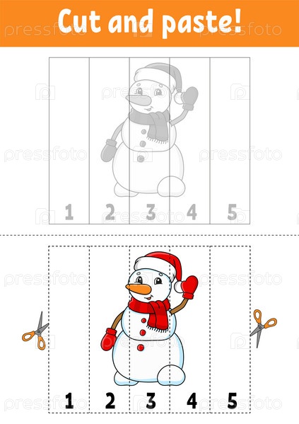 Изучаем цифры от 1 до 5. Вырезаем и склеиваем. Персонаж мультфильма. Образовательный развивающий рабочий лист. Рождественская тема. Игра для детей. Страница с заданиями. Цветная изолированная векторная иллюстрация