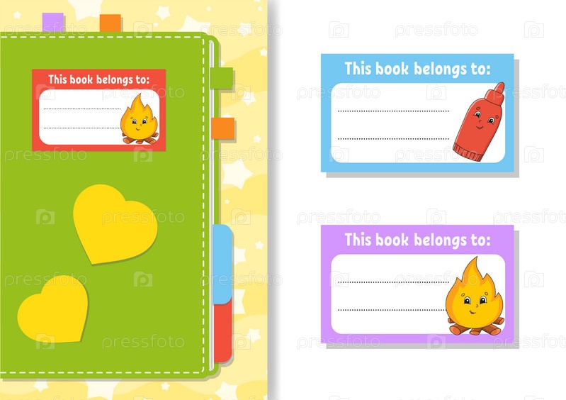 Наклейки на этикетки книг для детей. Прямоугольная форма. Изолированная цветная векторная иллюстрация. Персонаж мультфильма. Для дневника, блокнота, книги