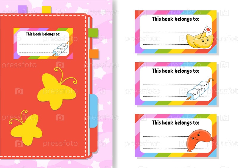 Наклейки на этикетки книг для детей. Прямоугольная форма. Изолированная цветная векторная иллюстрация. Персонаж мультфильма. Для дневника, блокнота, книги