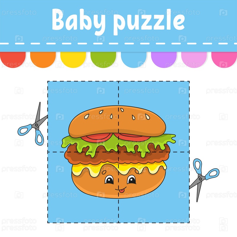 Детская головоломка. Легкий уровень. Флэш-карточки. Разрезай и играй. Рабочий лист с заданиями по цвету. Игра для детей. Персонаж мультфильма