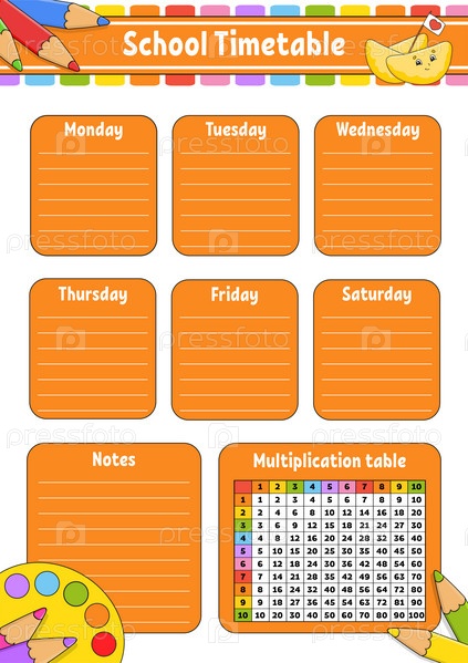 Расписание школы с таблицей умножения. Для обучения детей. Изолировано на белом фоне. С милым персонажем мультфильма