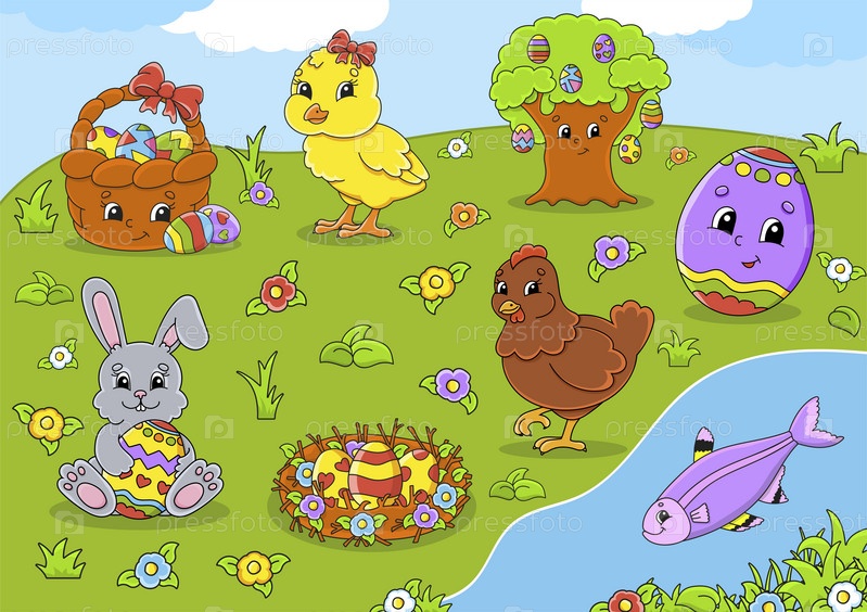 Набор милых мультяшных персонажей. Пасхальный клипарт. Нарисованный от руки. Красочный пакет. Векторная иллюстрация. Коллекция нашивок. Элементы дизайна этикеток. Для ежедневника, дневника, органайзера