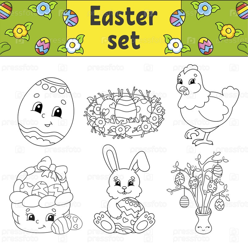 Раскраска для детей. Пасхальный клипарт. Веселые персонажи. Векторная иллюстрация. Милый мультяшный стиль. Черный контурный силуэт. Изолирован на белом фоне