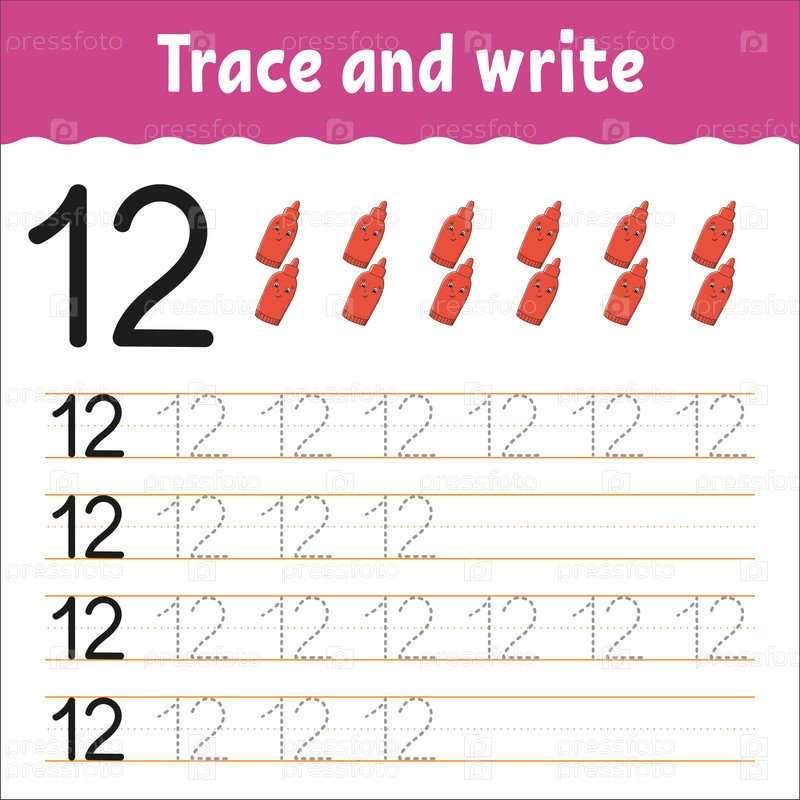 Изучайте цифры. Обводка и письмо. Практика письма. Изучение цифр для детей. Образовательный развивающий рабочий лист. Цветная страница с заданиями. Изолированная векторная иллюстрация в милом мультяшном стиле